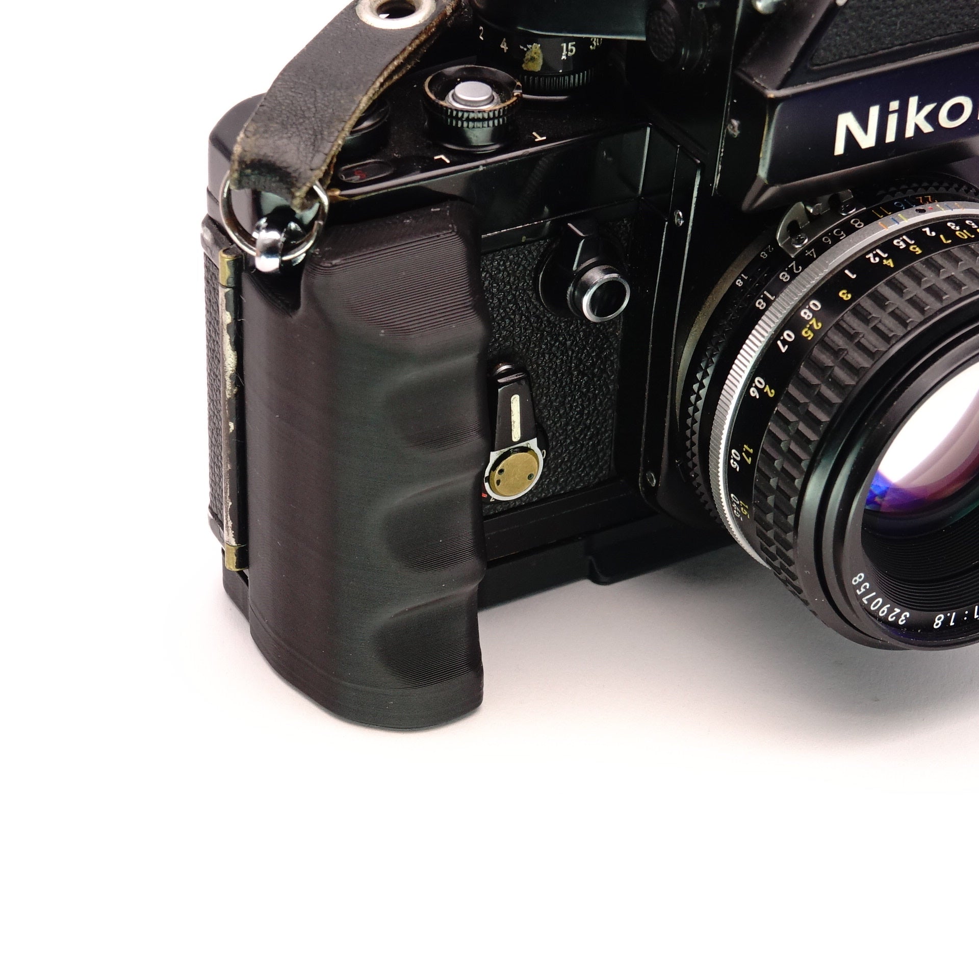 • Krampf in der Hand? Die Nikon F2 ist ein massives Werkzeug, liegt aber kantig und schwer in der Hand. Dieser Griff verbessert die Ergonomie spürbar.