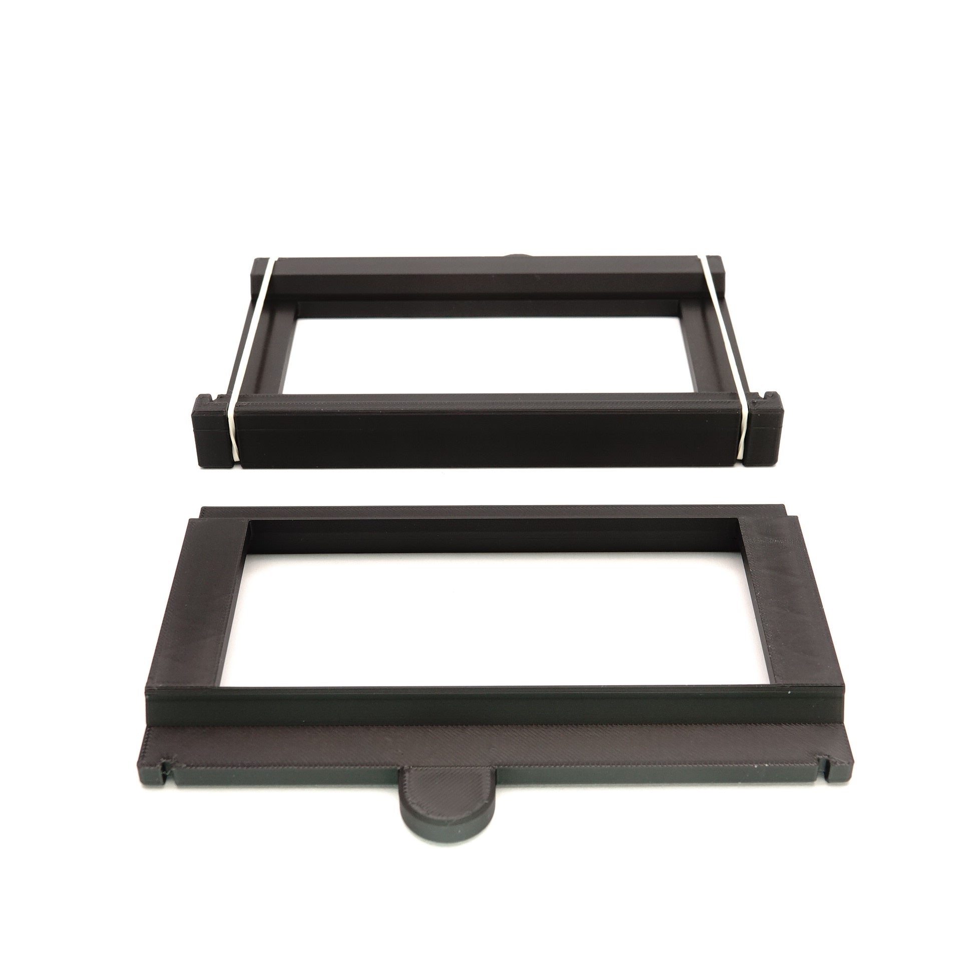 Die Funktionsweise ist rein mechanisch: Der Film wird zwischen Basis- und Deckplatte eingelegt und die Einheit mit den beiliegenden Gummibändern fixiert. Durch seitlichen Druck auf die Ausbuchtungen lassen sich die Platten minimal spreizen, um den Film zum nächsten Bild weiterzuschieben, ohne alles neu aufbauen zu müssen.