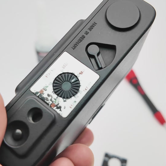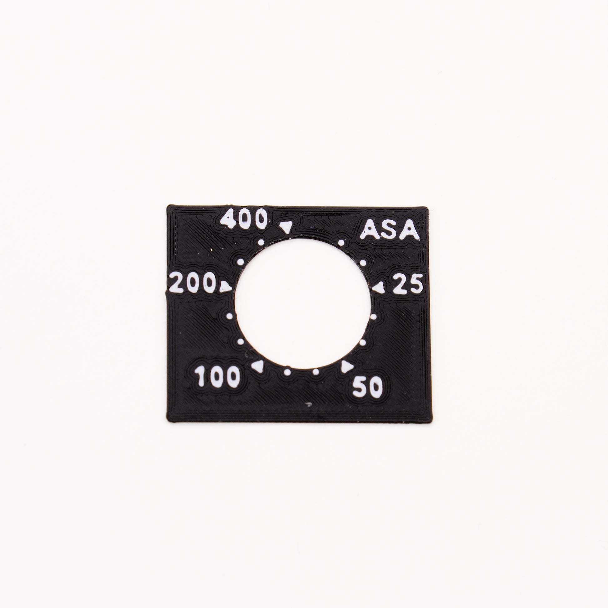 Wer eine Minox 35 nutzt, kennt das Phänomen: Die aufgedruckten ISO-Zahlen auf dem Einstellrad verabschieden sich mit der Zeit. Wir haben eine dauerhafte Lösung konstruiert. Durch die Fertigung aus zwei verschiedenfarbigen Kunststoffen sind die Ziffern untrennbar mit der Plakette verbunden. Kein Abrieb, kein Verblassen. Die alte Scheibe wird einfach entfernt und die neue mit einem winzigen Tropfen Sekundenkleber fixiert.