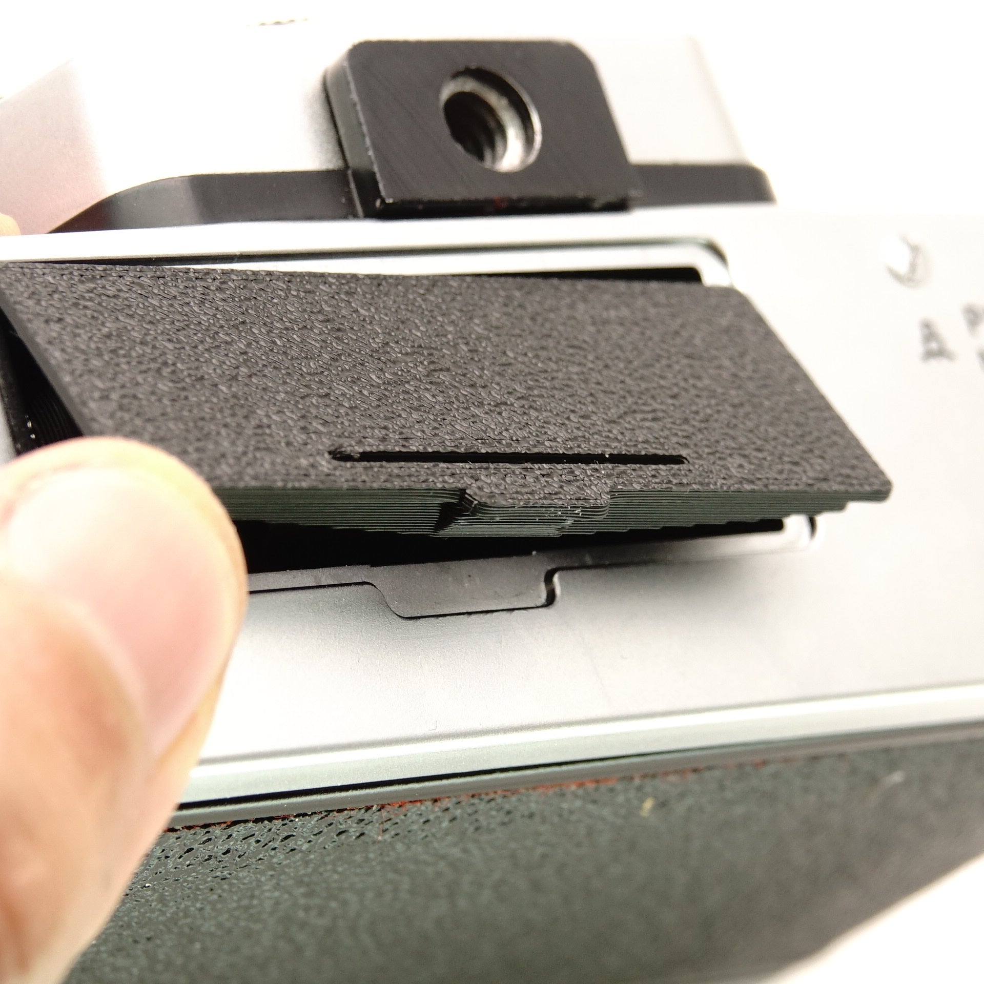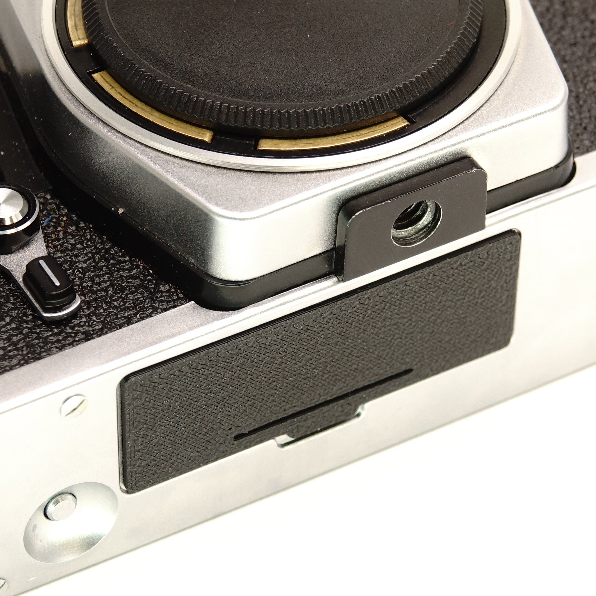 Esta tapa del compartimento de la batería asegura que tu Praktica esté lista para usar nuevamente. Muchos modelos de la serie L (especialmente los con transmisión eléctrica de diafragma) así como el posterior MTL50 necesitan esta tapa especial de rosca para mantener la batería segura dentro del cuerpo. La pieza está fabricada en resistente PLA+ y restablece el contacto para la medición de la exposición.