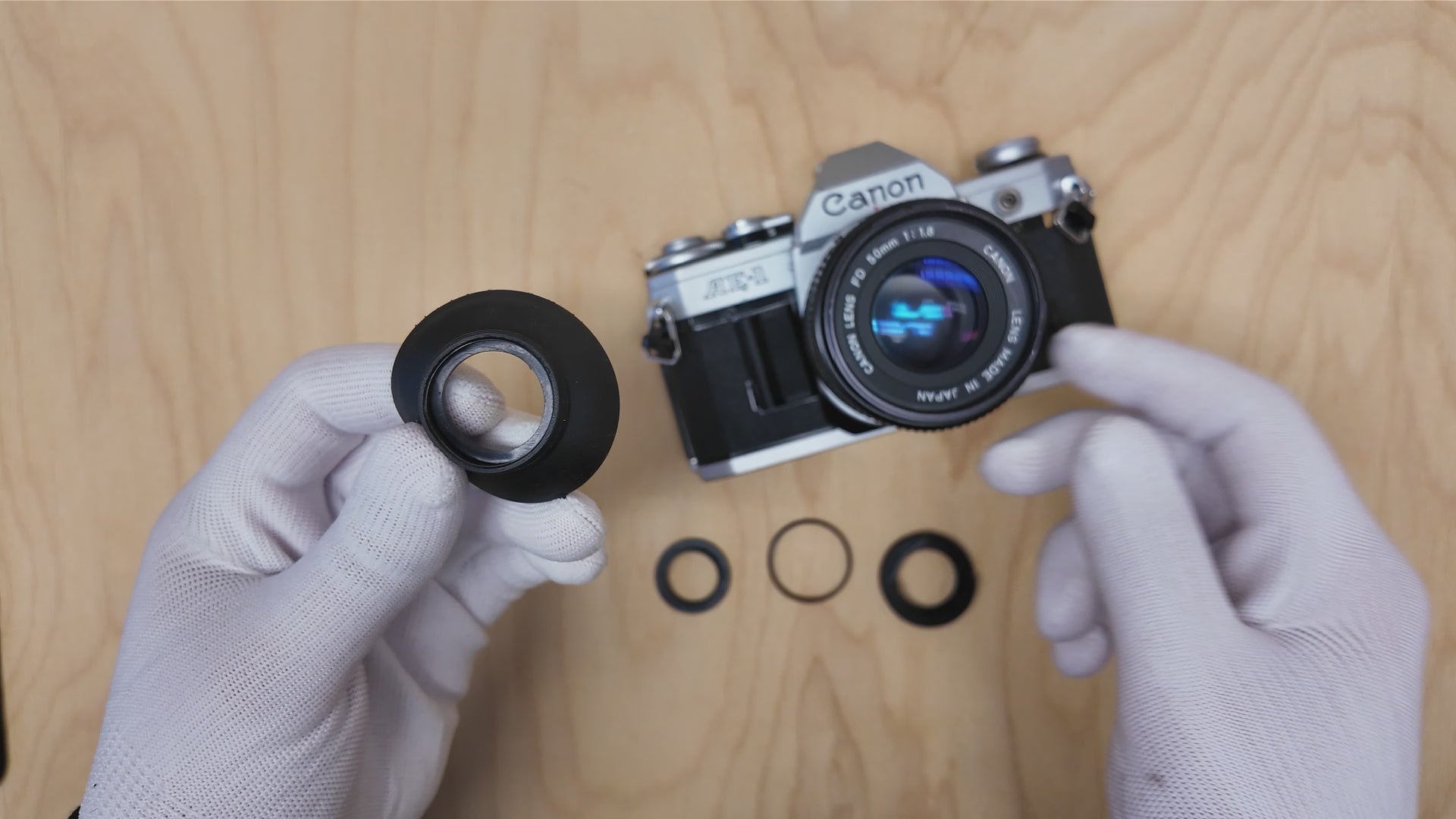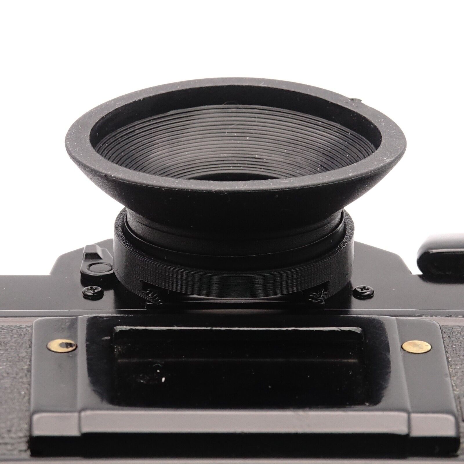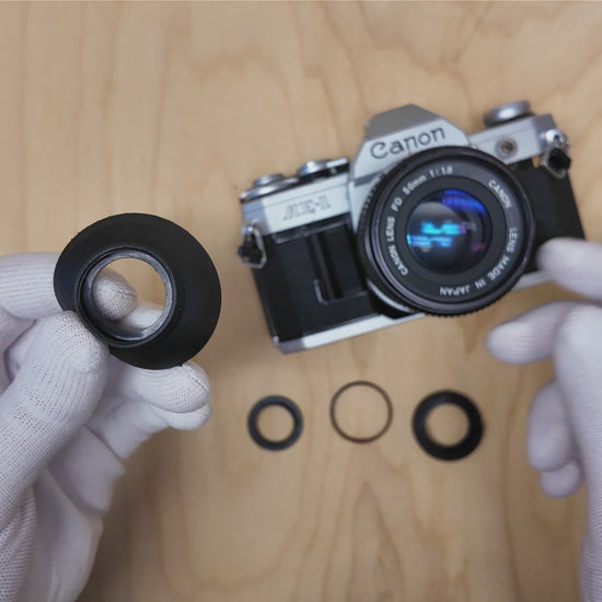 Las gomas originales para los ojos de la serie Canon A hoy en día casi no se encuentran en buen estado. Por eso hemos desarrollado una solución que combina un adaptador hecho con impresión 3D con una goma moderna para el ojo. El set se desliza fácilmente sobre el ocular de tu cámara y queda seguro. Proporciona una visión cómoda, protege las lentes de tus gafas y bloquea la luz ambiental molesta.