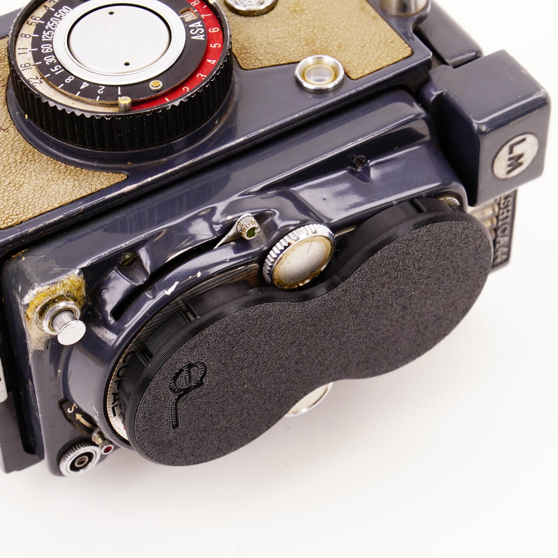Yashica 44A : Ce modèle a un simple filetage filtre 28,5 mm (pas de baïonnette) et un bouton rotatif pour l’avancement du film.