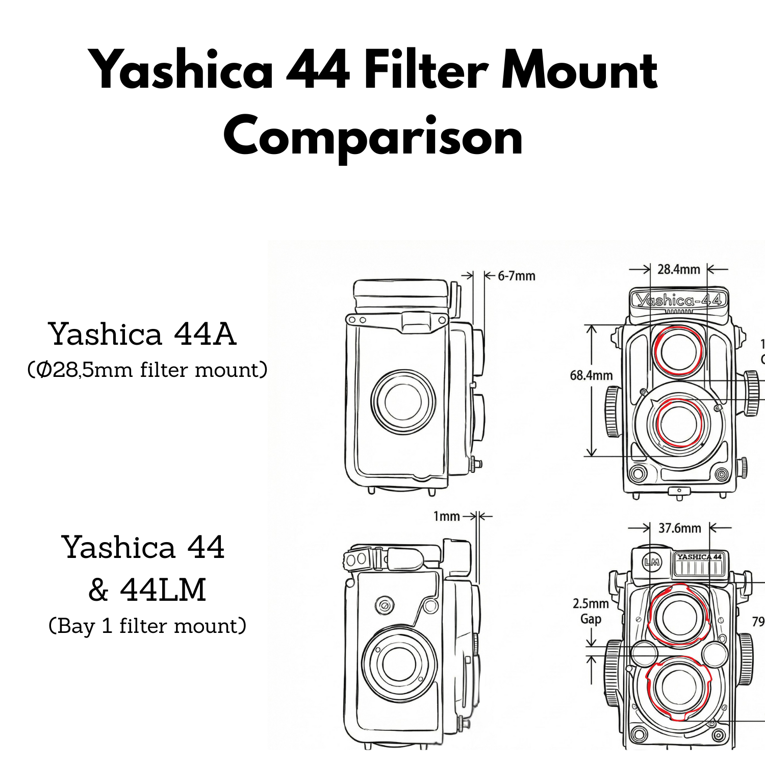 Yashica 44 & 44LM : Ces modèles utilisent Bay 1 (baïonnette 1) sur les deux objectifs. Caractéristique : la 44 a une manivelle, la 44LM un posemètre et un bouton rotatif.
