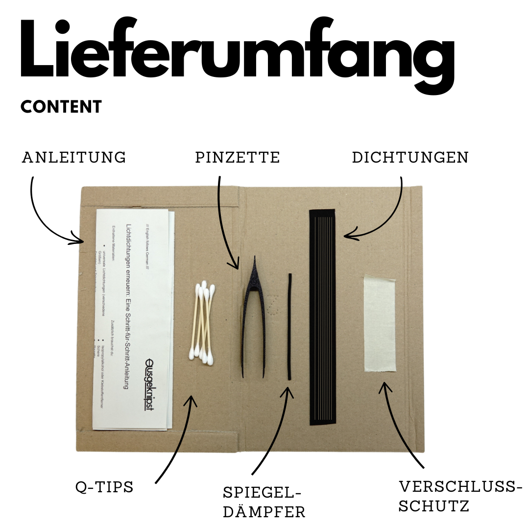 Invece di affidarsi a ritagli laser specifici per modello, che spesso si strappano inserendoli nelle scanalature strette, questo set utilizza strisce universali. Sono più resistenti da maneggiare e le tagli tu stesso alla lunghezza necessaria. Il set contiene materiale a sufficienza per avere riserve anche in caso di un primo tentativo fallito o per sigillare subito una seconda fotocamera. Un po' di isopropanolo (non incluso) ti aiuta inoltre a rimuovere i residui di colla vecchi.