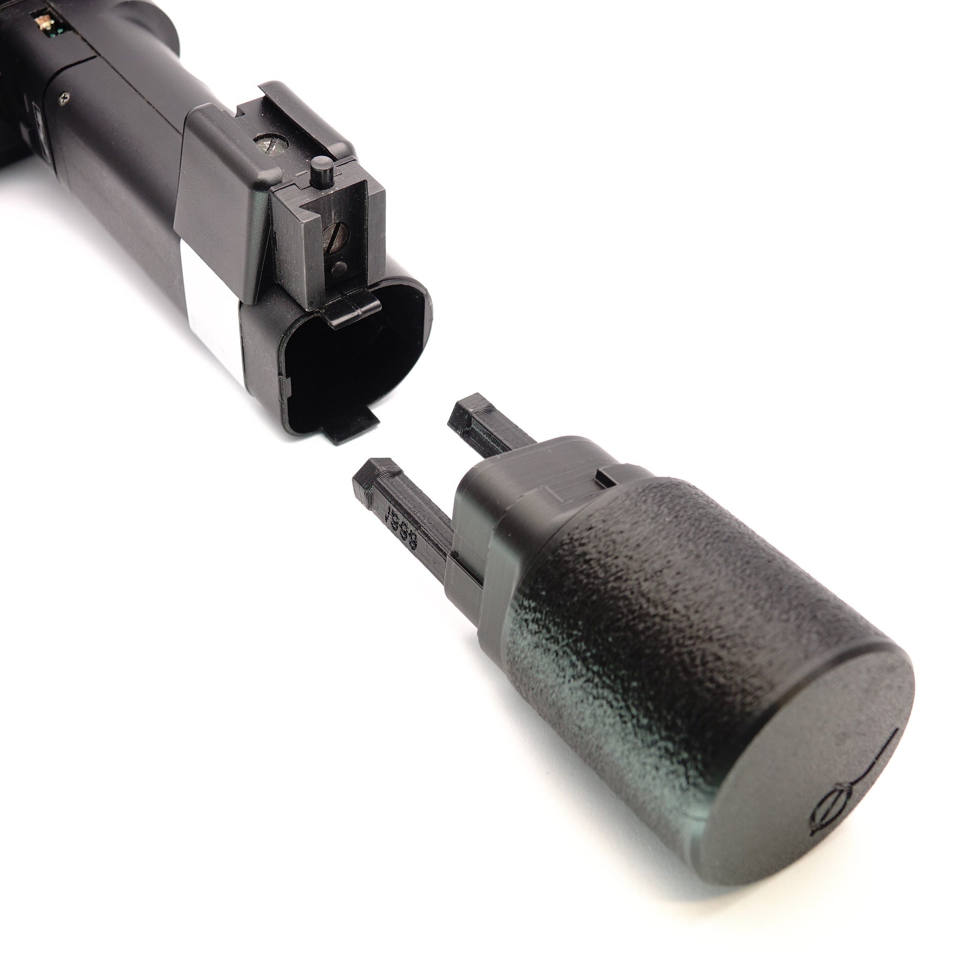 This battery holder is made as a sturdy replacement for the original Metz 45-39 holder. It is made of technical plastic (PLA+) and provides a stable housing for 6 AA cells. The base can be unscrewed to quickly change the batteries.