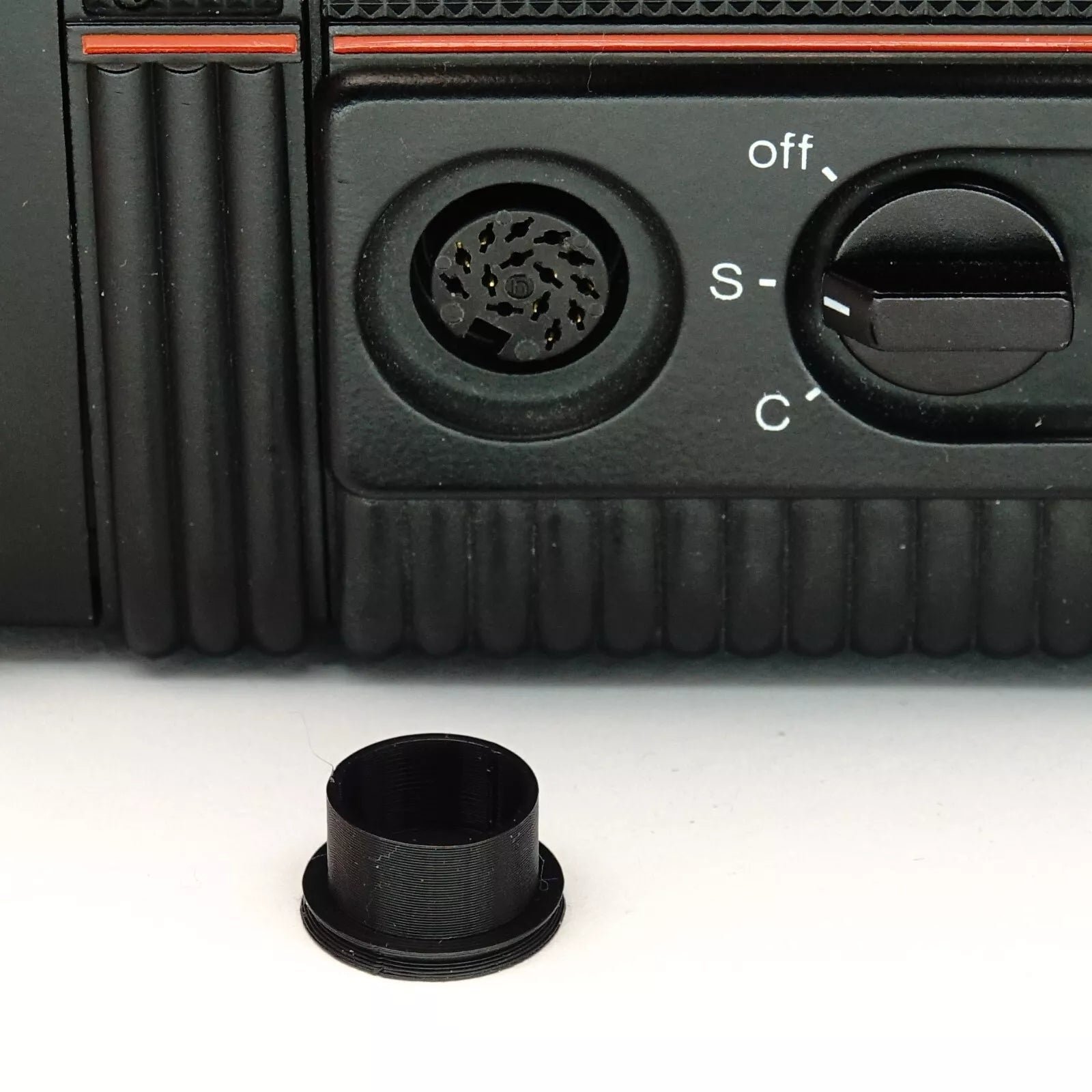 This cover replaces the often missing cap for the Universal Connection Socket of the Rolleiflex 6000 series. It also fits exactly on the side port (Side Socket for exposure and battery charging) of the motorised Hasselblad 500 EL cameras (often marked as red 17 in the manual). This keeps your contacts clean and the electronics protected.