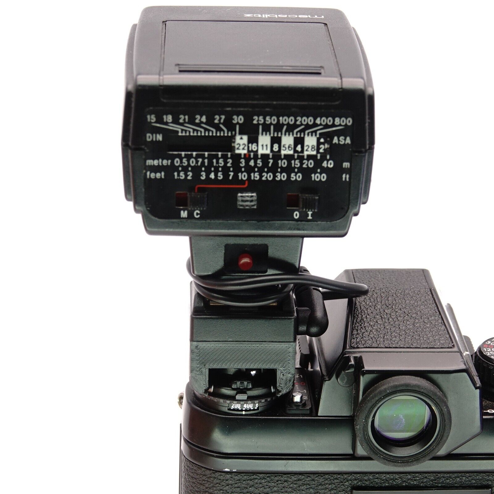 • No flash shoe on the viewfinder? The Nikon F3 and the old Canon F-1 do not have a standard ISO shoe. Our adapter solves this problem.