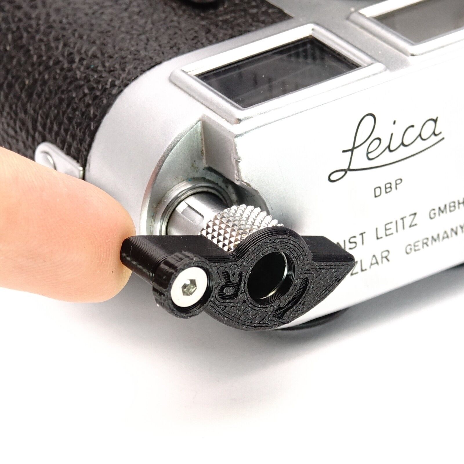 Note: Please check beforehand whether there is a minimal gap between the rewind button and the top cover of your camera. This space can vary with Leica bodies and is necessary for the free movement of the lever.