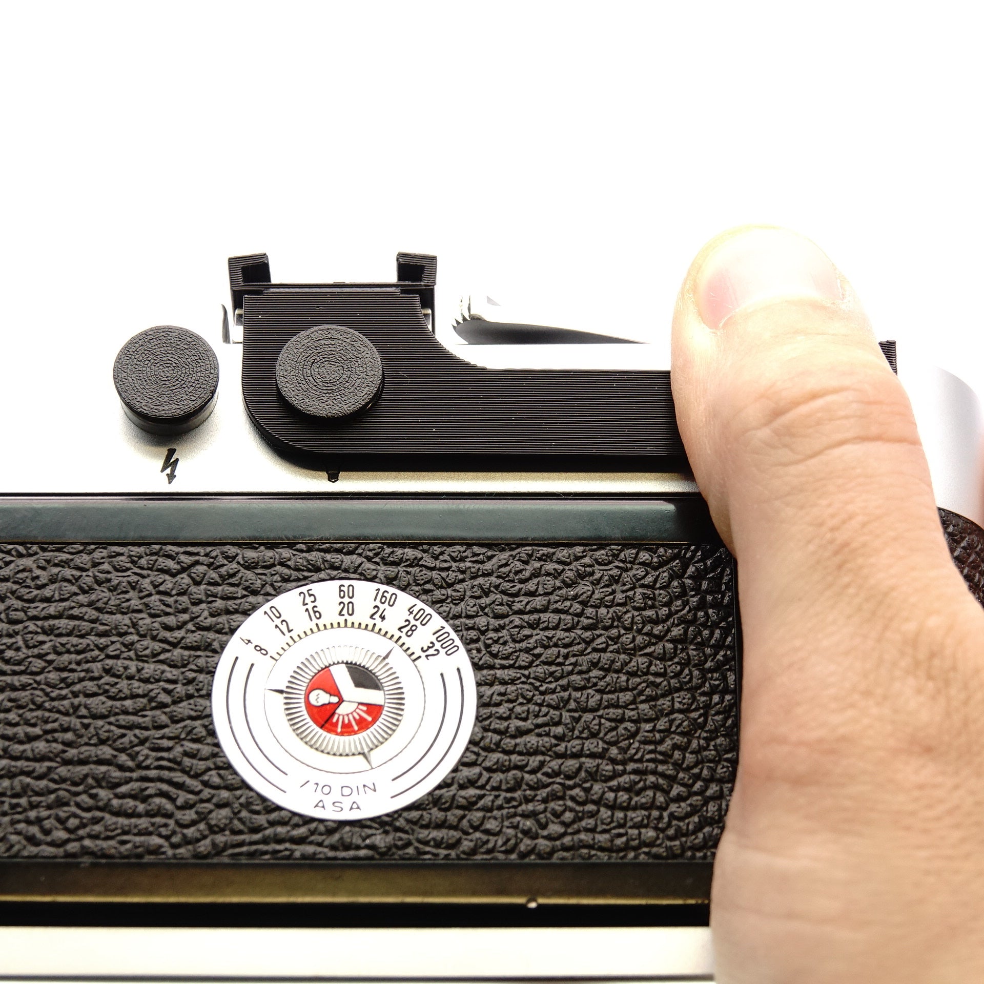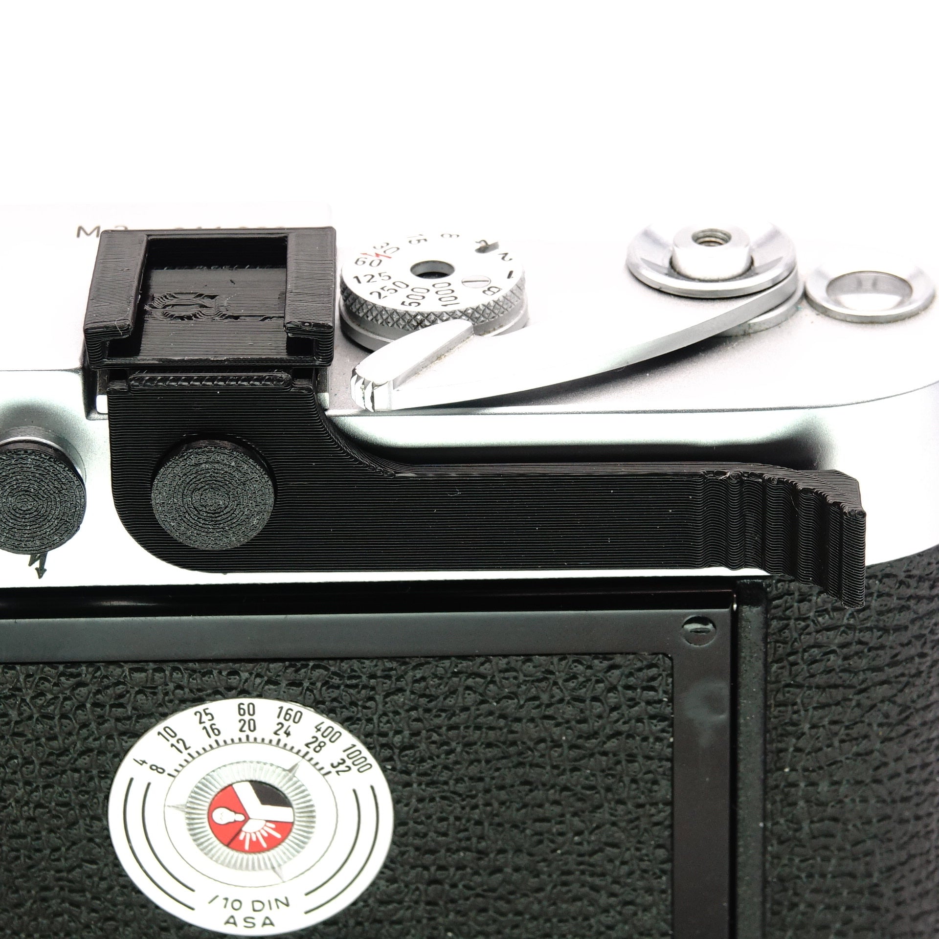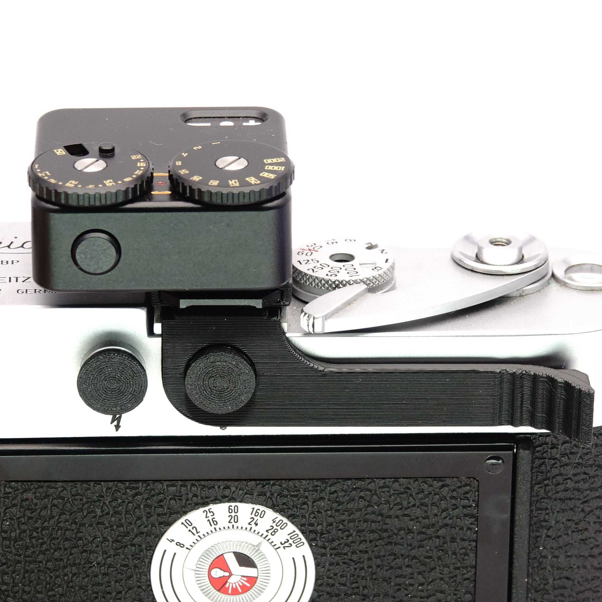 This thumb rest is simply slid into the flash shoe and noticeably improves the handling of classic Leica M-cameras. We designed it to fit seamlessly against the body and support the thumb in a natural position. Especially important to us was the through-running accessory shoe: many photographers use external light meters on the analogue M-models – with this grip, that space remains usable. Made from sturdy technical plastic for long-lasting use.